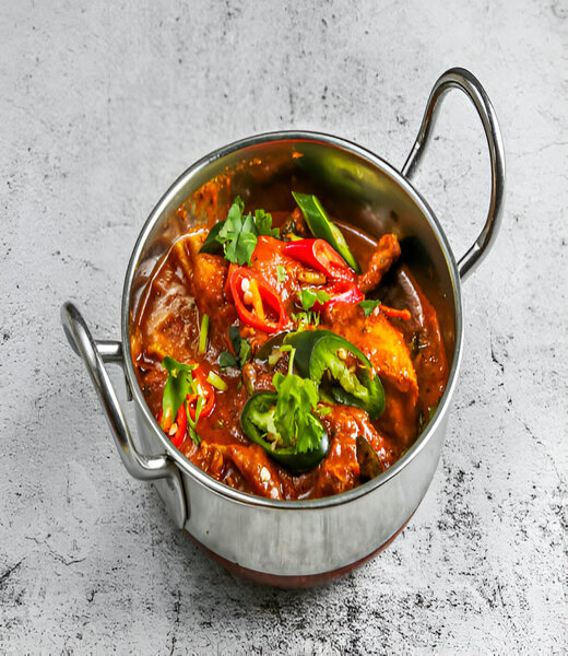 Scharf gewürzte Hühnerstücke in einer reichhaltigen, intensiv