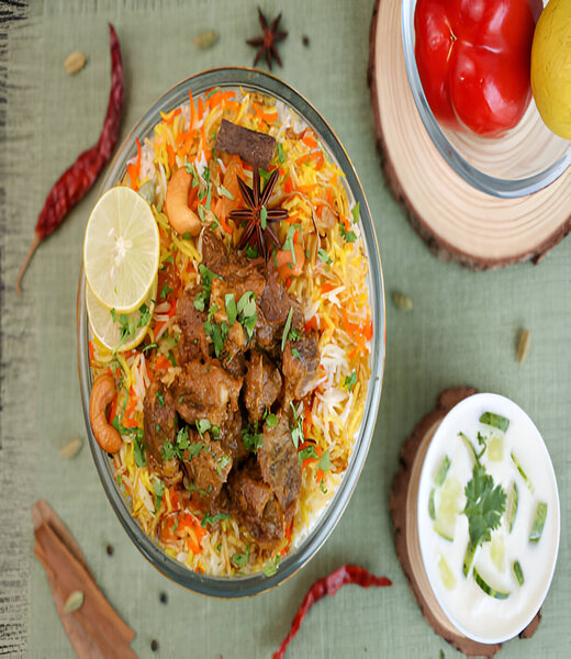 Gedämp es Basma-Reis und Zahrtr Hünerfiletatücke zubereitet in Beryani Gewürzmischung